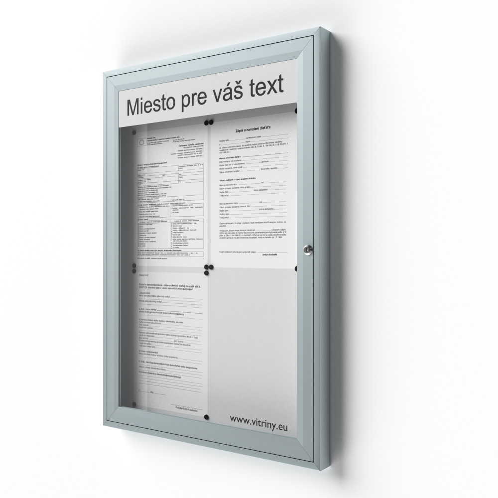 Integrovaný priestor pre vaše označenie vitríny Textom, Erbom prípadne firemné logo zabezpečí 80mm vysoká integrovaná plocha. Plocha s názvom je tak chránená pred možným strhnutím vandalmi. Toto prevedenie vám nezmenší vystavovanú informačnú plochu!