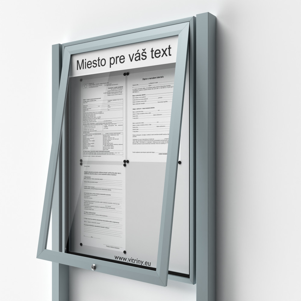 Integrovaný priestor pre vaše označenie vitríny Textom, Erbom prípadne firemné logo zabezpečí 80mm vysoká integrovaná plocha. Plocha s názvom je tak chránená pred možným strhnutím vandalmi. Toto prevedenie vám nezmenší vystavovanú informačnú plochu!
