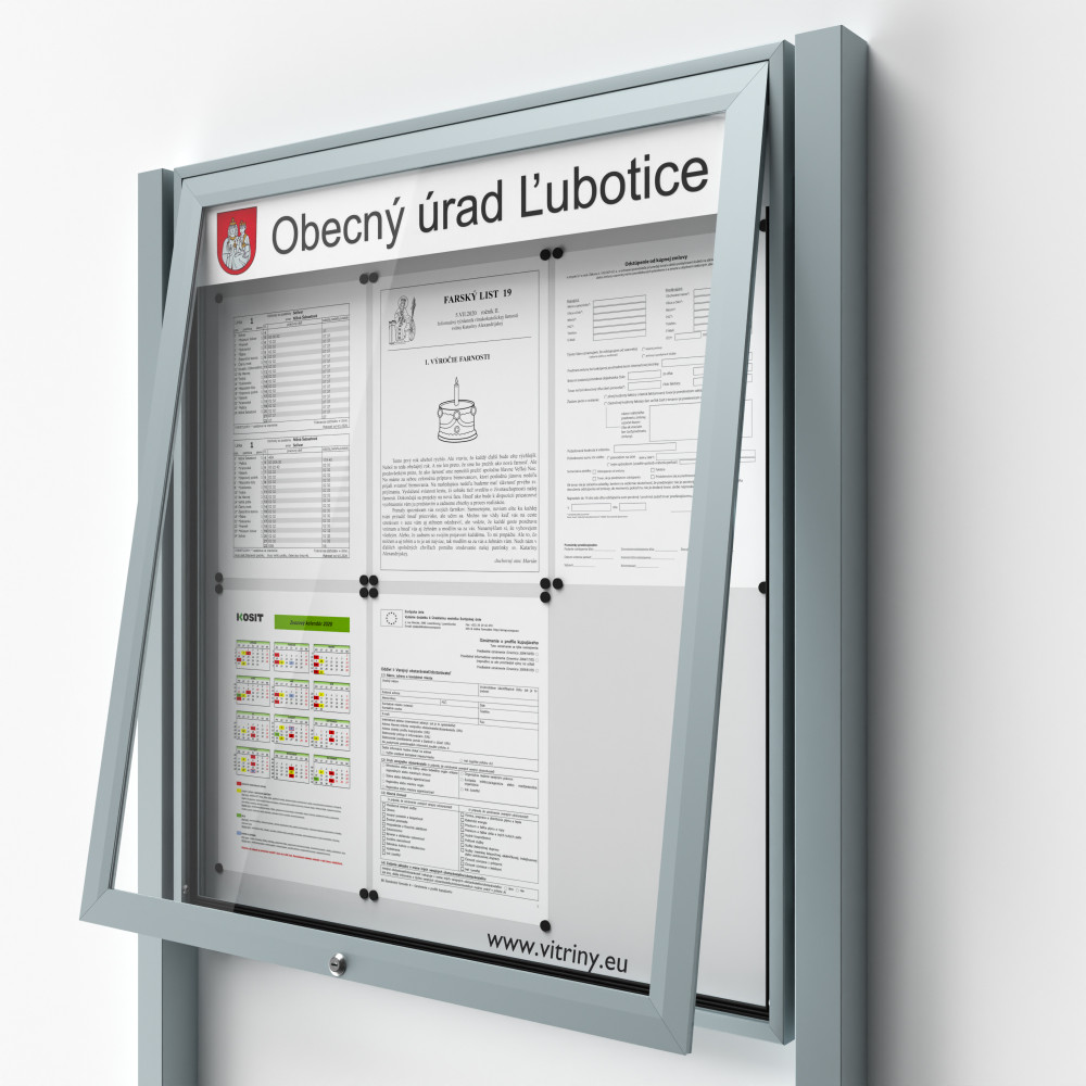 Ak potrebuje detailne označiť informačnú vitrínu erbom čí textom, 80mm vysoká integrovaná plocha je dobre ukrytá vo vnútri vitríny pred vandalmi. Plocha pre označenie vitríny vám nezmenší vystavovanú informačnú plochu ani nebude prekrývať informačné oznamy umiestnené v informačnéj vitríne!